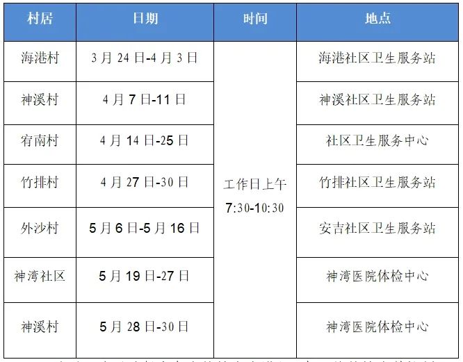 "体检地点:" - 中山市神湾镇社区卫生服务中心 - 中山市神湾镇各村委会卫生站(具体地点根据村委会分布而定)
