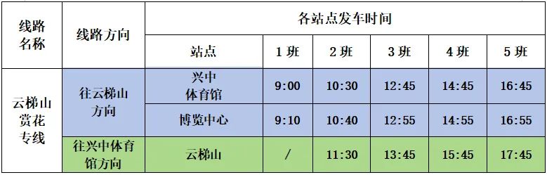 图为云梯山赏花专线运行时刻表(温馨提示:本线路实行“人等车”运行模式,建议市民游客提前到达指定站点候车。)